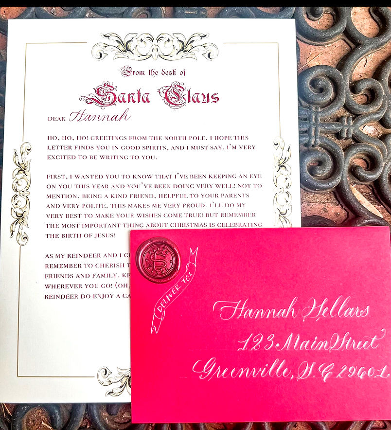 Open your mailbox to the gift of joy from Santa Claus. This letter is written from yours Truly - Santa Claus. A custom letter written to your child, with their name, and address addressed from the Big Guy in calligraphy. This is perfect for the holiday to give your little ones the magic and joy that Santa Claus and his elves can do during the holidays.